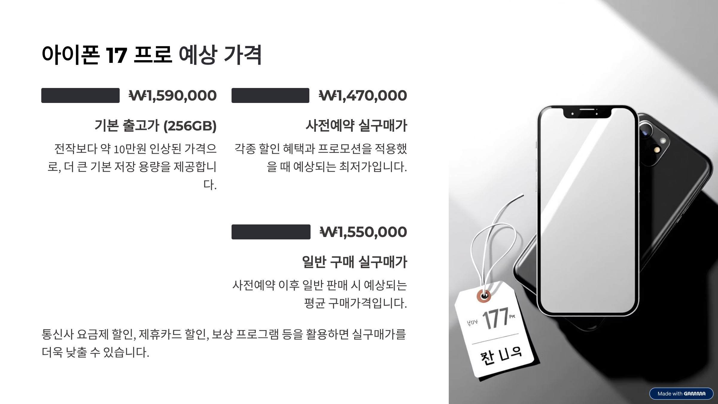 통신사 사전예약에서는 단말 할인, 요금제 지원금, 제휴카드할인, 사은품까지 종합적으로 비교해야 가장 저렴하게 구매할 수 있습니다. 일부 예약처에서는 한정된 물량에 한해 출고가 기준 최대 12만 원 상당의 할인, 에어팟·케이스 등 액세서리 증정, 애플케어 20% 할인 등의 특별 프로모션이 적용되니 필히 사전 조사가 필요합니다. 실구매가는 사전예약 성공 시 약 147만 원 내외, 일반 구매 시 155~160만 원이 형성될 것으로 예상됩니다.
