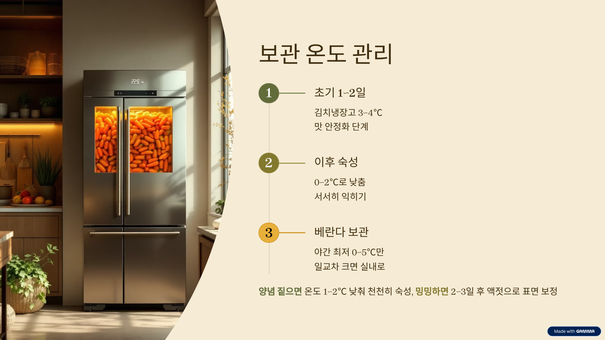 첫 배치에서 충분히 맛을 확인한 뒤 다음 배치 양념에 즉시 반영하면 전체 결과가 균일하게 나옵니다. 양념은 2~3통으로 나누어 사용해 배치별 수분 편차에 따른 희석을 최소화하십시오. 김치냉장고가 있다면 초기 1~2일은 3~4℃에서 초숙성한 후 0~2℃로 내려 맛을 안정화합니다. 베란다 보관은 야간 최저 0~5℃ 구간에서만 권장하며, 일교차가 크면 실내로 회수해 냉장 보관으로 전환하는 편이 안전합니다. 양념이 진하게 느껴지면 숙성 온도를 1~2℃ 낮춰 시간을 두고 안정시키고, 밍밍하면 2~3일 후 표면에 액젓 한두 큰술로 가볍게 보정하는 것이 과잉 조정을 피하는 요령입니다.