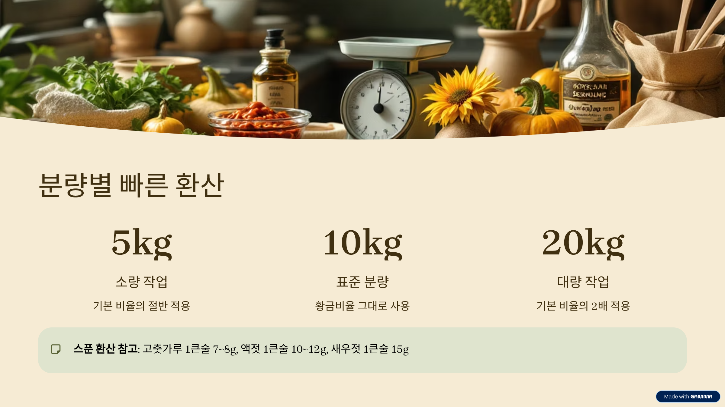 스푼 환산은 보정용으로 보되, 보통맛 10kg 기준으로 고춧가루 320~340g은 대략 40~48큰술, 멸치액젓 260g은 22~26큰술, 새우젓 80g은 5~6큰술, 마늘 180g은 12~13큰술, 생강 40g은 2.5~3큰술, 찹쌀풀 700g은 되직한 죽 기준 약 2.5~3컵 정도로 이해하시면 현장에서 빠르게 대응하기 좋습니다.