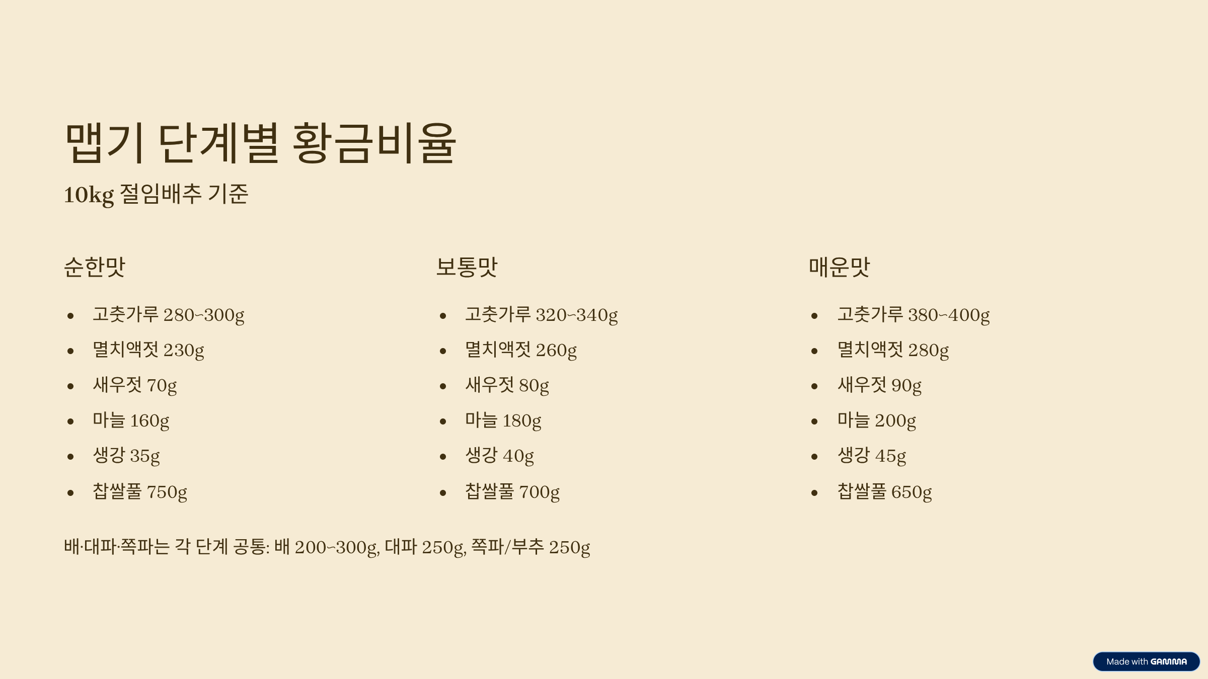 평창 고랭지 기준 10kg 절임배추 속에 맞춘 세트입니다. 순한맛은 고춧가루 280~300g, 멸치액젓 230g, 새우젓 70g, 마늘 160g, 생강 35g, 찹쌀풀 750g, 다진 대파 250g, 배 또는 사과 간 것 300g, 쪽파 또는 부추 250g, 황설탕 또는 매실청 40~60g, 굵은소금 10~15g 정도로 잡습니다. 보통맛은 고춧가루 320~340g, 액젓 260g, 새우젓 80g, 마늘 180g, 생강 40g, 찹쌀풀 700g, 대파 250g, 배 또는 사과 250g, 쪽파/부추 250g, 당류 40g, 굵은소금 10~15g이 기준입니다. 매운맛은 고춧가루 380~400g, 액젓 280g, 새우젓 90g, 마늘 200g, 생강 45g, 찹쌀풀 650g, 대파 250g, 배 또는 사과 200g, 쪽파/부추 250g, 당류 20~30g, 굵은소금 10g 내외를 추천합니다.