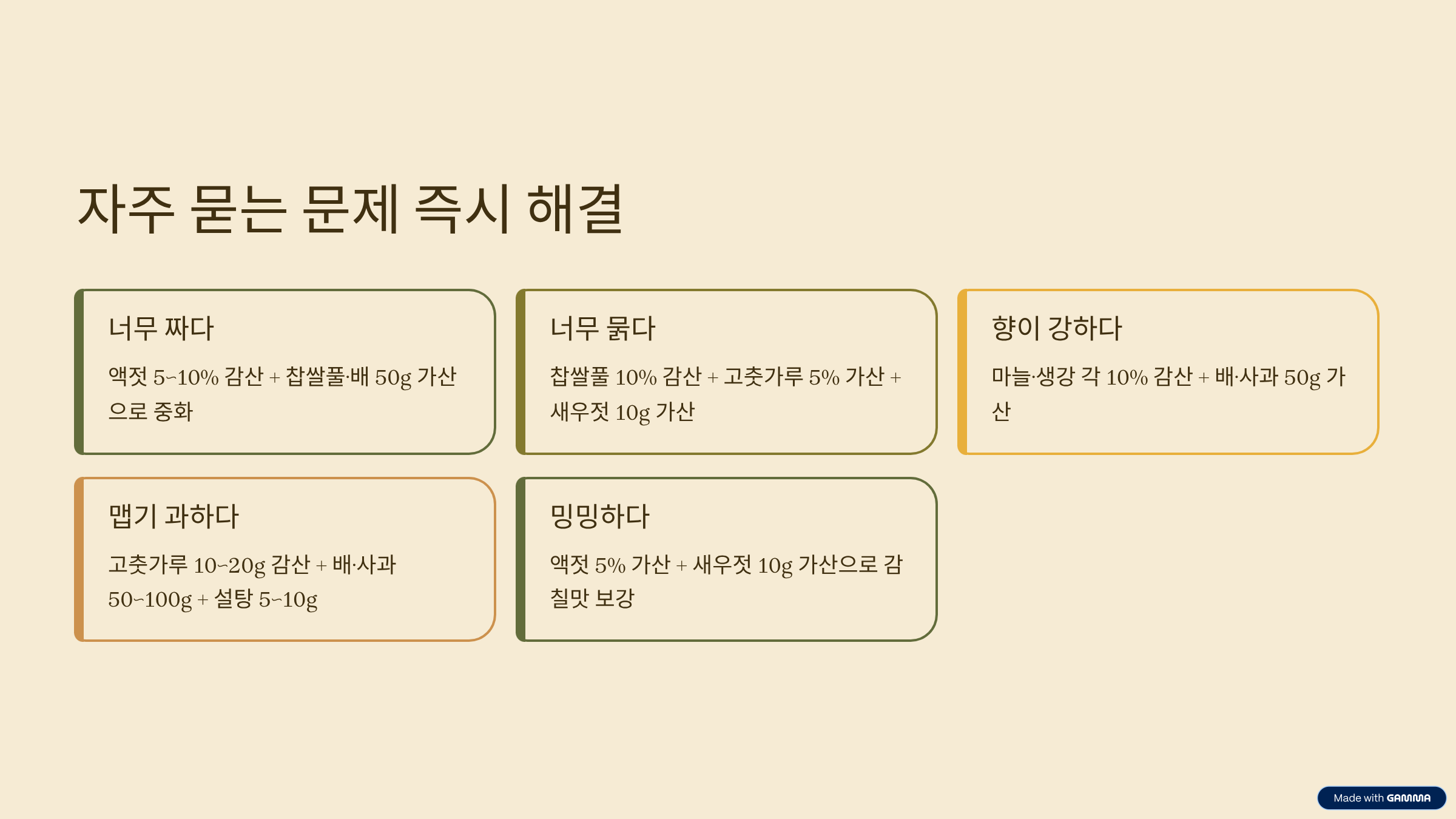 짠맛이 강하면 액젓을 5~10% 줄이고 찹쌀풀이나 배 갈이를 소량 더해 농도로 완화하세요. 양념이 묽게 흘러내리면 찹쌀풀 10% 감산과 고춧가루 5% 가산으로 점도와 색을 회복합니다. 향이 과하면 마늘과 생강을 각각 10% 줄이고 배·사과를 50g 보강해 부드럽게 균형을 맞추십시오. 맵기가 과하면 고춧가루를 10~20g 줄이고 배·사과를 50~100g 더해 자극을 눌러 주고, 밍밍하면 액젓 5%와 새우젓 10g 보강으로 중저역대를 채우는 방식이 안정적입니다.