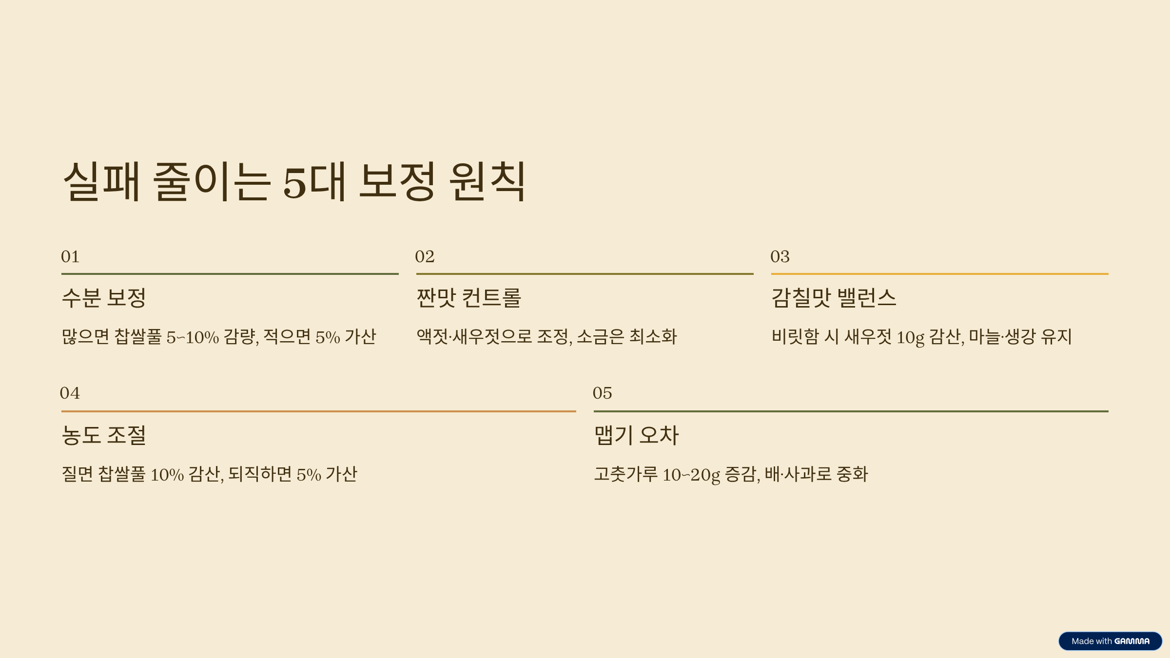 수분이 많은 느낌이면 찹쌀풀을 5~10% 줄이고 고춧가루를 5% 정도 늘리되, 액젓은 유지하는 편이 안정적입니다. 반대로 수분이 부족하면 찹쌀풀과 액젓을 각각 5% 정도 보탠 뒤 농도를 확인하며 미세 조정하세요. 간이 짜면 액젓을 5~10% 줄이고 찹쌀풀을 5% 늘려 농도로 완화하는 쪽이 깔끔합니다. 밍밍함은 액젓 5%와 새우젓 10g 정도 보강으로 중저역대 감칠맛을 받쳐 주는 방식이 좋습니다.