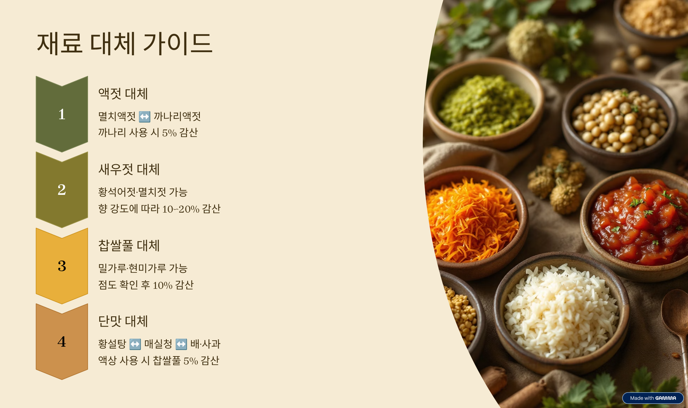 멸치액젓을 까나리액젓으로 전량 대체할 때는 짠맛과 감칠맛의 결이 달라 5% 감산으로 시작하는 편이 안전합니다. 새우젓은 황석어젓이나 멸치젓으로 대체 가능하나 향 강도가 다르므로 10~20% 감산으로 출발해 주세요. 찹쌀풀은 밀가루나 현미가루로 대체할 수 있지만 점도 차이가 있으니 10% 감산 농도로 끓여 합류시키는 것이 좋습니다. 단맛은 설탕·매실청·배/사과 갈이로 상호 대체 가능하되, 액상류를 늘리면 총 수분이 증가하므로 찹쌀풀을 5% 줄여 전체 균형을 맞추는 방식을 권합니다.