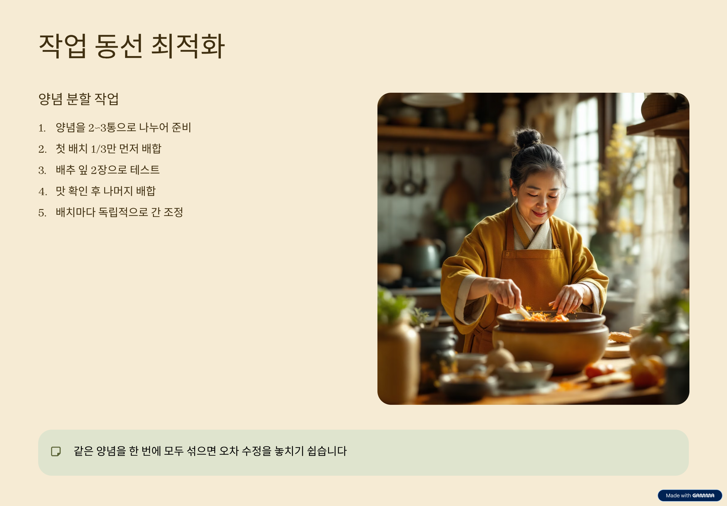 적용 순서는 단순한 것이 좋습니다. 절임배추 잎 한 장을 먼저 맛보고 기준 세트로 양념의 3분의 1만 배합해 작은 볼에서 시범 적용합니다. 두 장 정도에 발라 간과 농도를 확인한 뒤 만족스럽다면 나머지 3분의 2를 합류하고, 최종 간은 소금보다 액젓·새우젓·찹쌀풀·고춧가루로 미세 조정하십시오. 양념은 한 통에 모두 섞기보다 2~3통으로 나눠 배치별 편차에 맞춰 보정하는 편이 안전합니다.