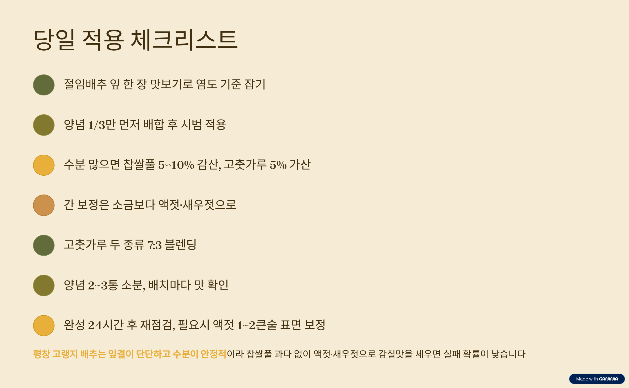 가족형은 순한맛 또는 보통맛의 하한치에서 시작해 마늘·생강은 표준치를 유지하고 고춧가루를 소폭 조정하는 방식이 무난합니다. 매운맛형은 보통맛 상한치나 매운맛 세트를 적용하되, 고춧가루 10~20g 단위로 탄력 조정하면 예측 가능성이 높습니다. 평창 배추는 양념 희석 위험이 낮으므로 초반부터 찹쌀풀을 과하게 쓰지 말고 액젓·새우젓으로 감칠맛을 세우며, 단맛은 숙성 중 자연스레 조화를 이루게 설계하는 편이 좋습니다.