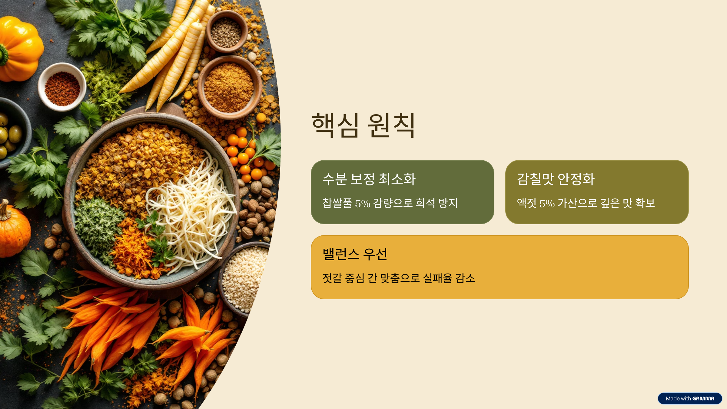 고춧가루는 태양초와 혼합 고춧가루를 7:3 정도로 블렌딩하면 색·향·맵기가 안정적으로 균형을 이룹니다. 액젓 브랜드를 바꿀 때는 8:2 정도의 소량 혼합으로 맛을 확인한 뒤 점진적으로 전환하세요. 젓갈 알레르기가 있다면 액젓과 새우젓을 배제하고 다시마·표고 우린물 150~200g을 보강한 뒤 소금 5~10g으로 마감 간을 맞추는 저젓·비건 변형도 가능합니다. 저염 설계가 필요하면 액젓을 10% 줄이고 찹쌀풀을 5% 늘려 점도로 안정감을 확보한 뒤, 마감 간은 다시마 우린물과 사과로 보조하면 자극을 낮출 수 있습니다.