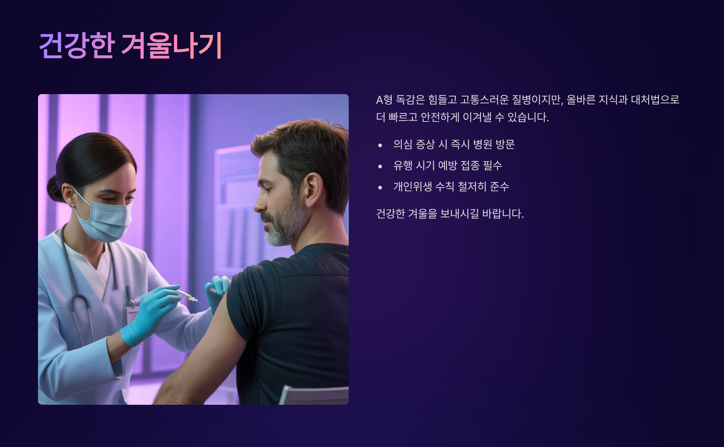 A형 독감은 분명 힘들고 고통스러운 질병이지만, 오늘 알려드린 증상과 대처법을 잘 숙지한다면 더 빠르고 안전하게 이겨낼 수 있습니다. 의심 증상이 있다면 주저하지 말고 병원을 방문하시고, 유행 시기에는 예방 접종과 개인위생 수칙 준수로 건강을 지키시길 바랍니다.