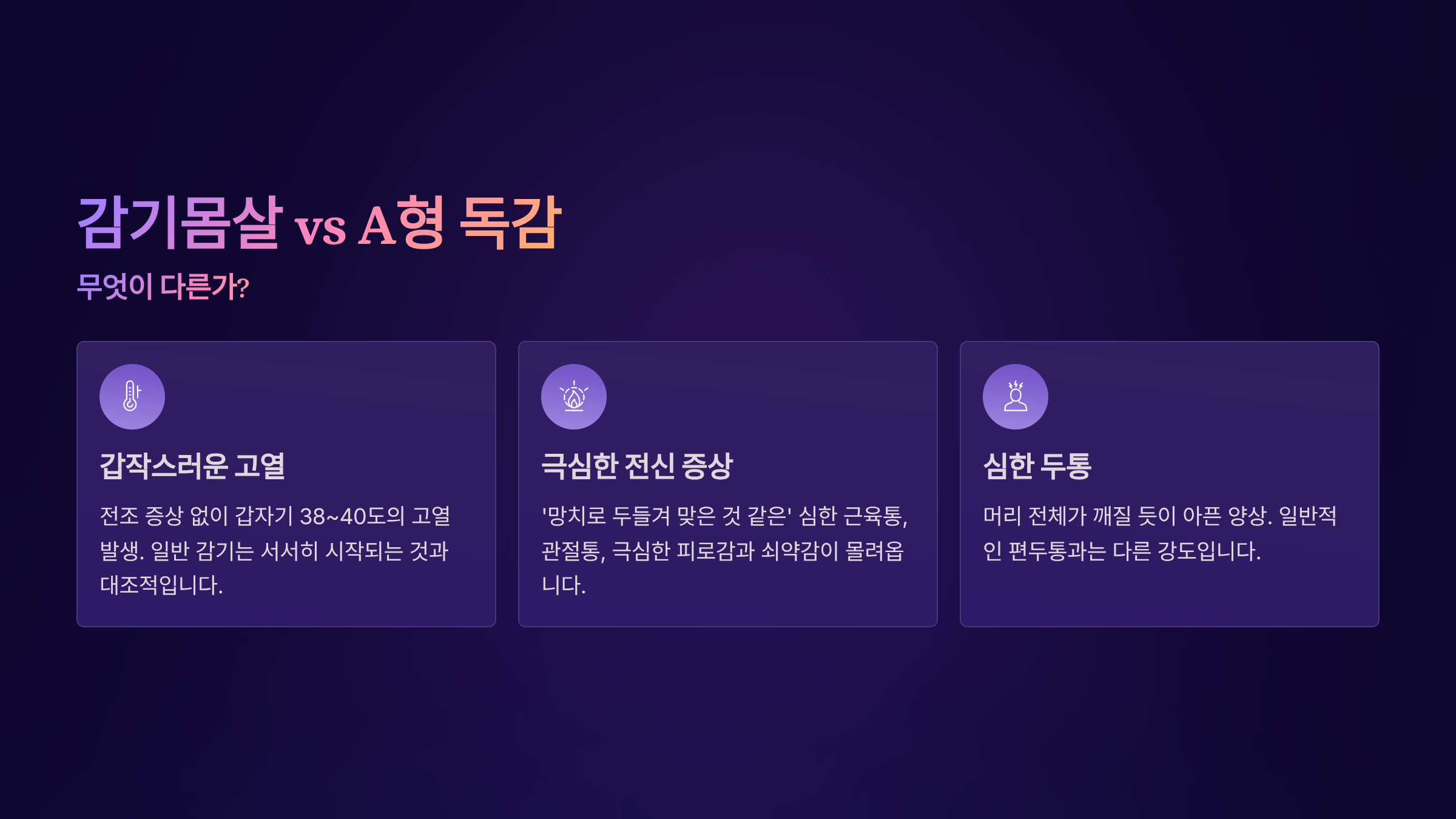 많은 분이 A형 독감과 일반적인 감기몸살을 혼동합니다. 하지만 둘은 발병 원인인 바이러스부터 증상의 '속도'와 '강도'에서 뚜렷한 차이를 보입니다.