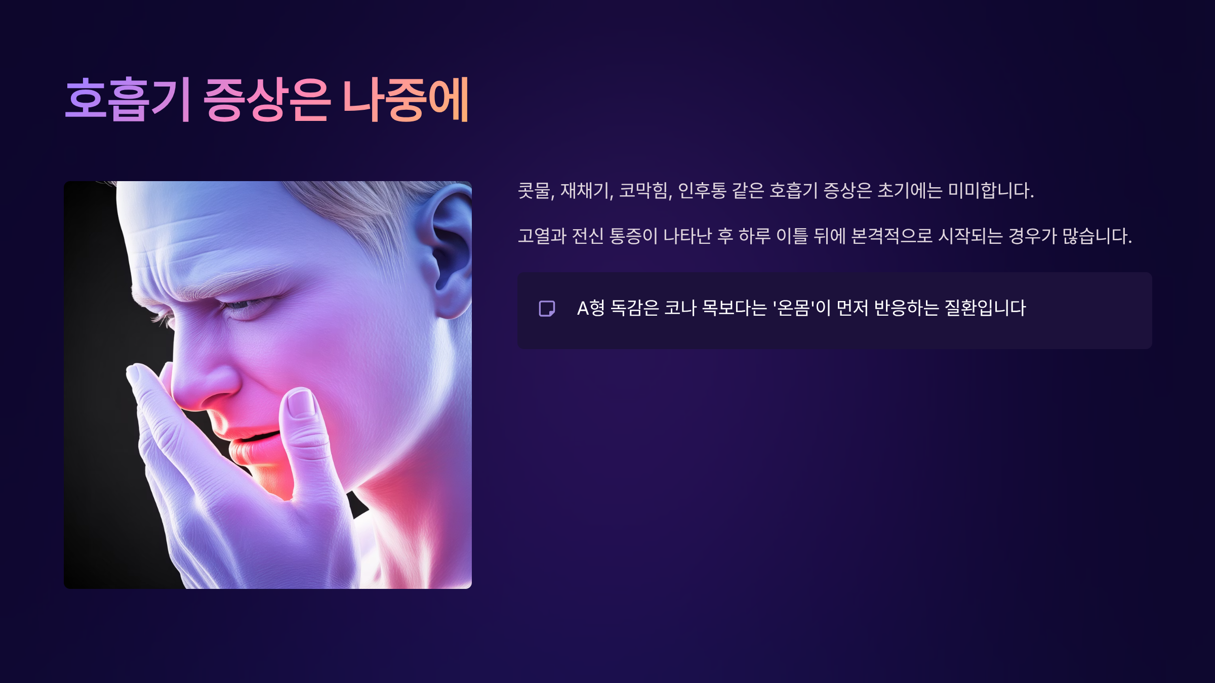 반면에 콧물, 재채기, 코막힘, 인후통(목 아픔)과 같은 호흡기 증상은 초기에는 미미하거나, 고열과 전신 통증이 나타난 후 하루 이틀 뒤에 본격적으로 시작되는 경우가 많습니다. 즉, A형 독감은 코나 목보다는 '온몸'이 먼저 반응하는 질환이라고 기억하는 것이 좋습니다.