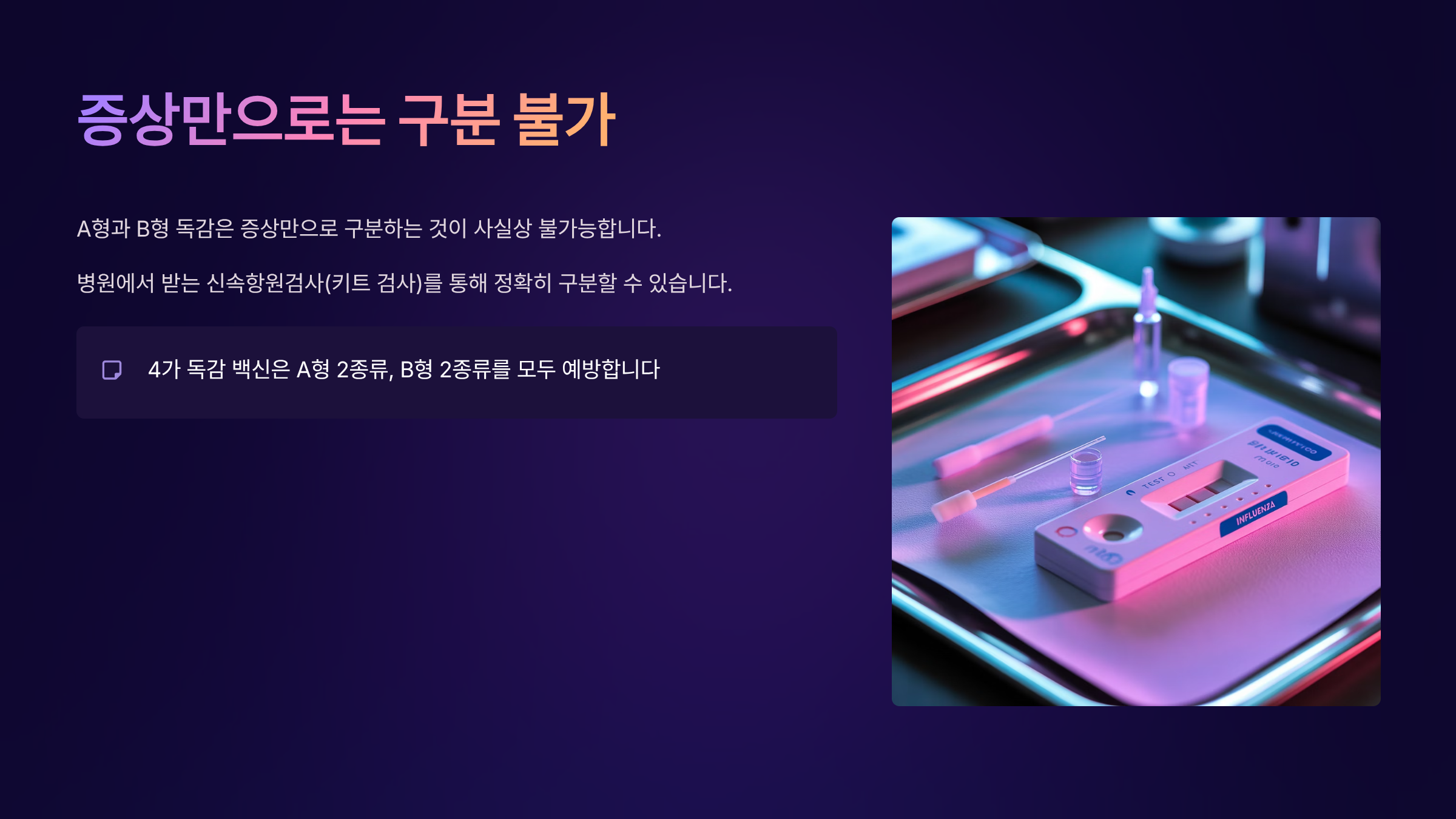 하지만 증상만으로 A형과 B형을 구분하는 것은 사실상 불가능하며, 병원에서 받는 신속항원검사(키트 검사)를 통해 정확히 구분할 수 있습니다. 우리가 접종하는 4가 독감 백신은 A형 2종류, B형 2종류를 모두 예방합니다.
